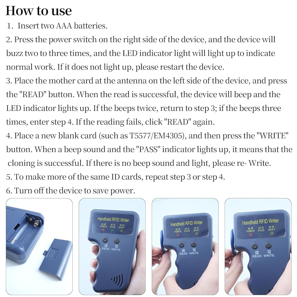 What You Get: The package includes 1pcs 125KHz handheld RFlD writer, 3pcs writable keyfob, 3pcs writable cards and a user manual (Notice: using the RFID reader needs two 1.5V AAA batteries and the batteries are not included in the package)