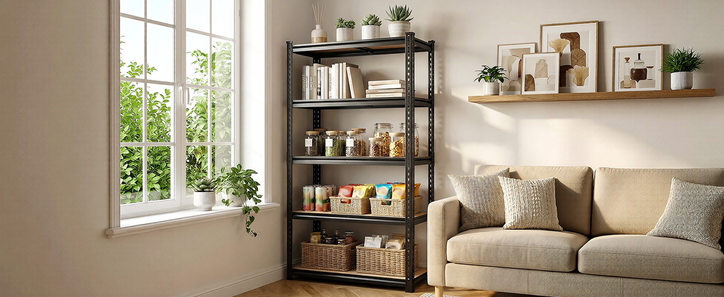 【72.1" H x 35.6" W – 5-Tier Garage Shelving for Pantry, Kitchen & More】Tired of getting different shelves for different rooms? This 5 tier shelving unit stands 72.1" tall, giving you vertical space to store bulky bins, tools, and pantry staples in one place. Each tier is designed to hold 27-gallon storage bins with ease—ideal for garage shelving, kitchen shelves, or pantry shelves that work with your space