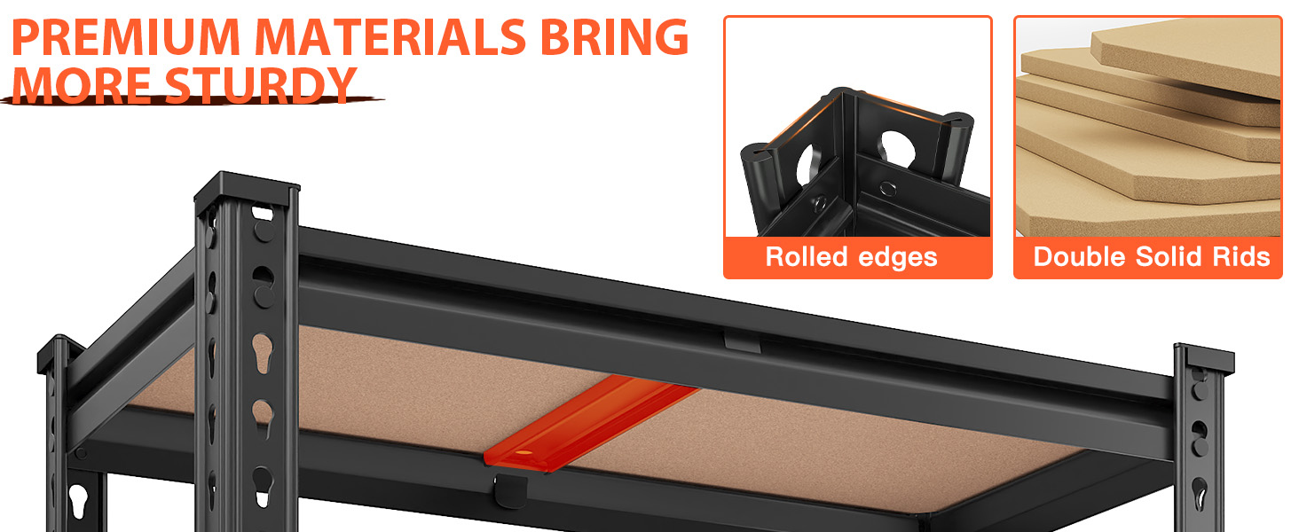【1.45mm Rolled- 5mm MDF – Built for Long-Term Use】Sharp edges can be a nuisance. This metal shelves for storage features smooth rolled-edge columns that protect your hands and belongings. Paired with 5mm thick high-density MDF boards (830kg/m³), each shelf stays flat and resists warping—keeping this heavy duty shelves system in great condition, even with 27-gallon bins fully loaded