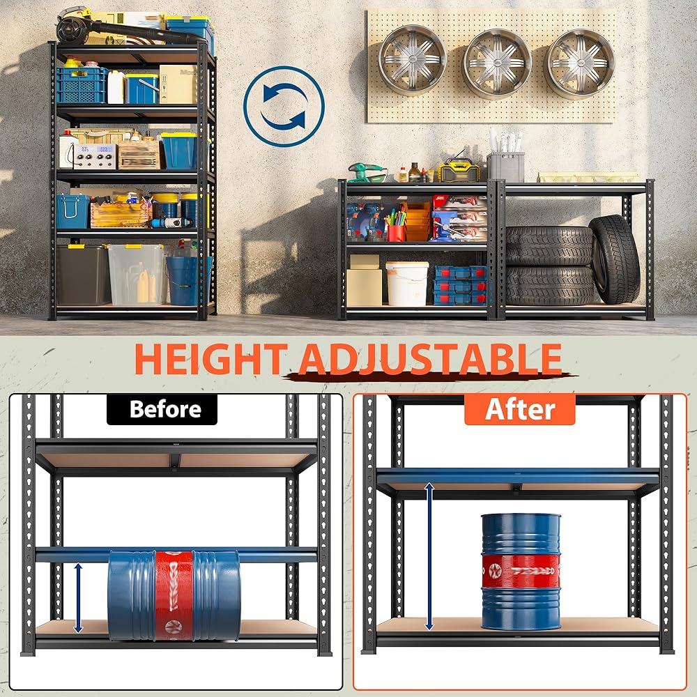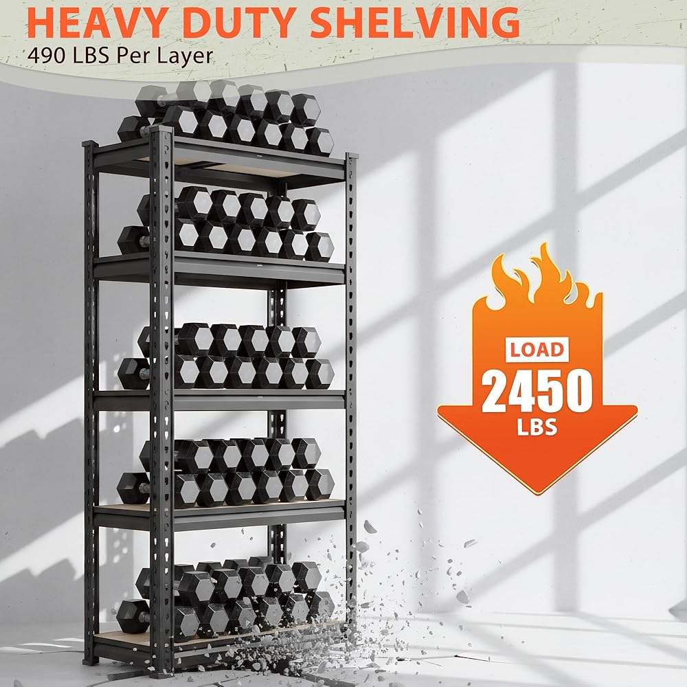 【2450LBS Capacity & 5 Support Rods – No More Wobbling or Sagging】Concerned about shelves holding heavy items? Each tier has a dedicated support rod, distributing weight across the 1.45mm thick rolled-edge frame. With 2450 lbs total capacity, this heavy duty storage shelves system handles fully loaded 27-gallon bins, toolboxes, and bulk items with ease—no bending or shifting