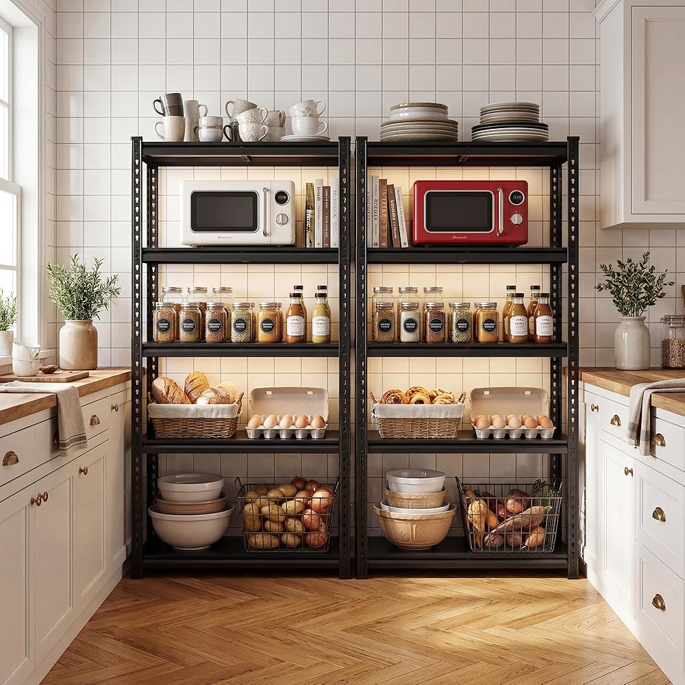 【 Adjustable Shelves & Split Design – Flexible Storage That Adapts】Struggling with fixed shelf heights? Simply reposition each tier to match your items—tall cereal boxes on your pantry shelf, 27-gallon storage bins on your garage storage rack. Need a workbench? This metal shelving unit splits into two sections for added versatility