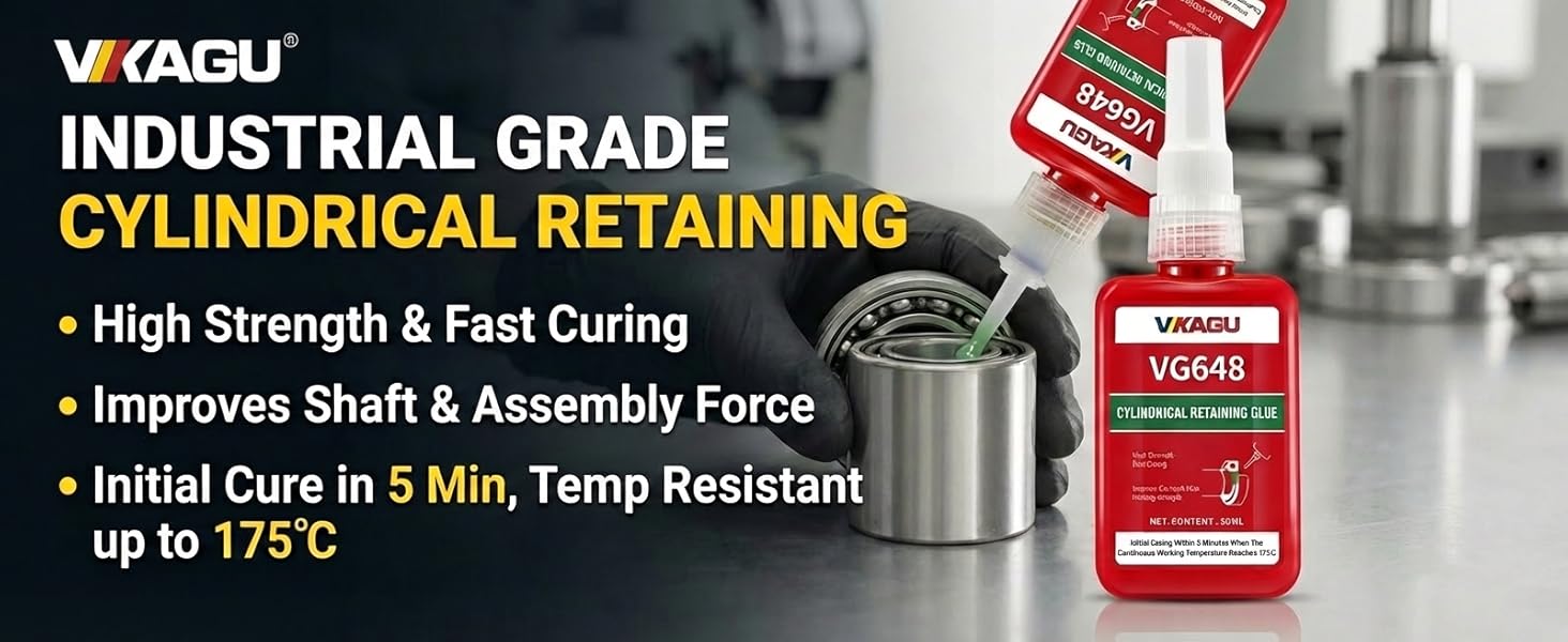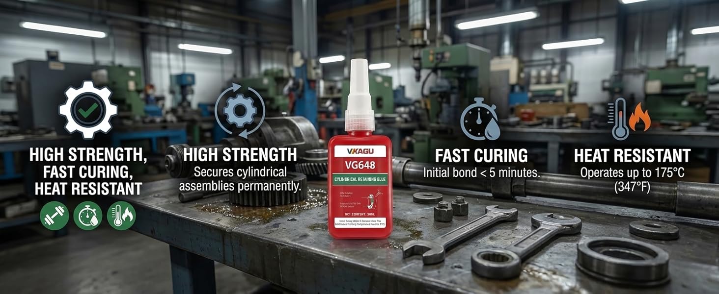 INDUSTRIAL GRADE HOLDING POWER – Designed for the bonding of cylindrical fitting parts. VG648 provides high-strength adhesion to lock bushings, bearings, gears, and pulleys onto shafts. It prevents loosening and leakage from shock and vibration, offering a reliable alternative for heavy-duty machinery and automotive maintenance