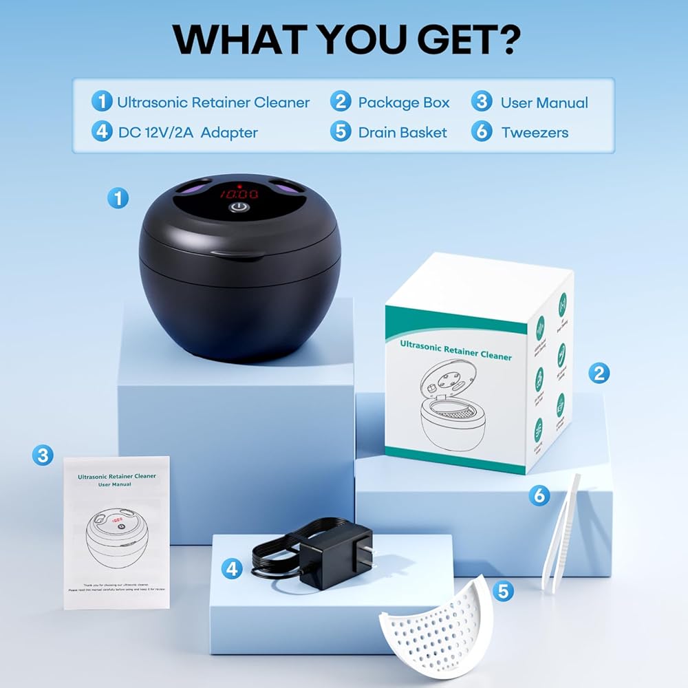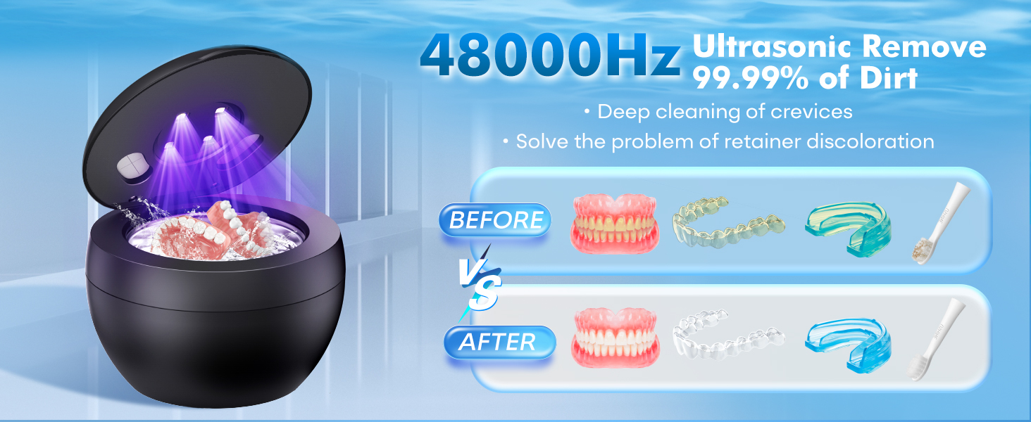 【48kHz Ultrasonic Cleaning】Utilizing 48,000Hz high-frequency ultrasonic technology, the retainer cleaner generates millions of finer nano-bubbles per second, effectively penetrating the tiniest crevices to remove 99.99% of stubborn stains. The high‑frequency vibration provides powerful cleaning while being gentle and harmless to the dental appliances. Suitable for all types of dental appliances (retainers, dentures, aligner, mouth guards, night guards, toothbrushes) and jewelry.