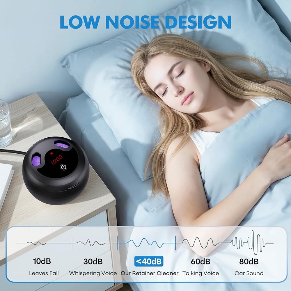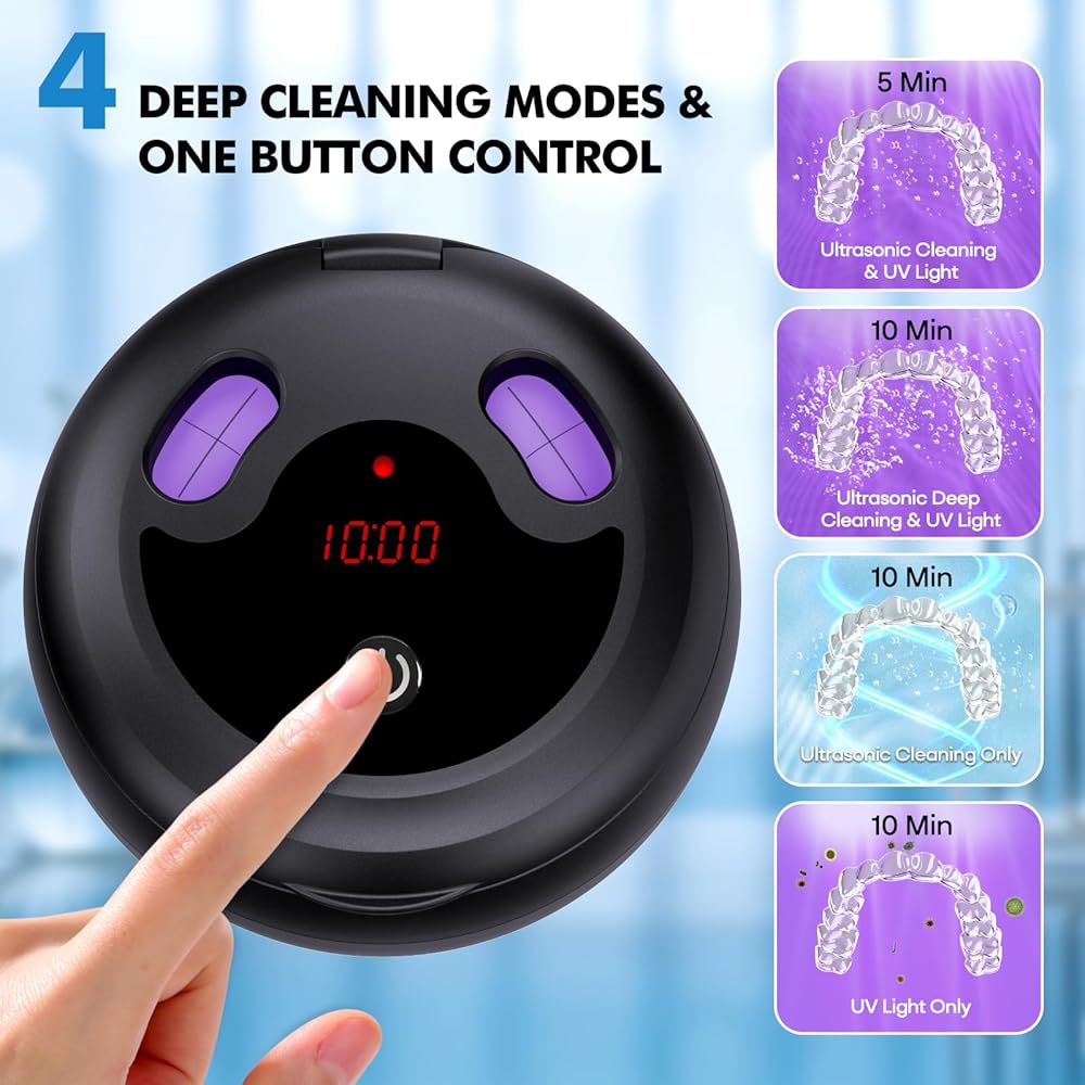 【UV Deep Cleaning】This ultrasonic retainer cleaner is equipped with 4 upgraded UV lights for 360° deep cleaning, effectively eliminating odors with cleaning power three times that of a regular toothbrush. The UV lights automatically shut off when the lid is opened for safety.
