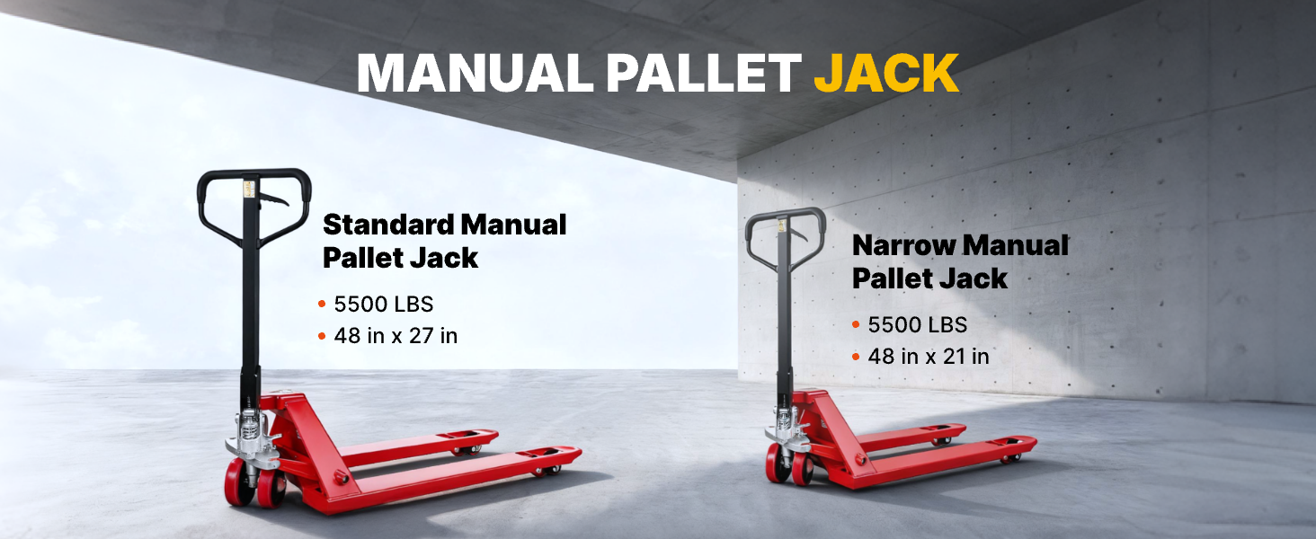 NARROW DESIGN: This narrow manual pallet jack features a 48"L x 27"W Forks, perfect for handling pallets in tight aisles and confined spaces. With a 5,500 lb load capacity, it offers the strength to move heavy loads efficiently in warehouse, retail, and industrial settings.