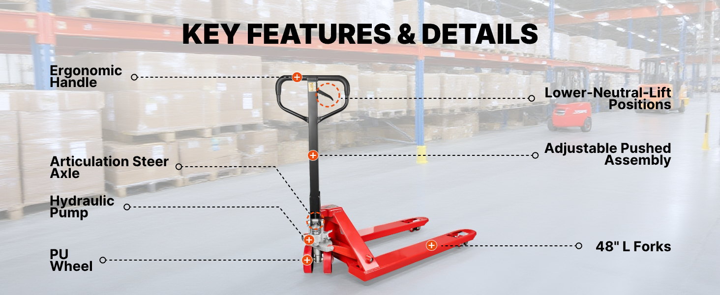INTEGRATED HYDRAULIC SYSTEM: The durable one-piece hydraulic pump with a built-in overload relief valve prevents excessive pressure, ensuring safer operation and extending the life of your pallet jack. Ideal for heavy-duty material handling tasks.