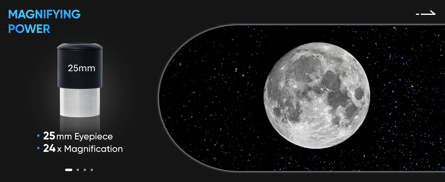 Optimum Magnification: Our telescope for kids and adults is quipped with two replaceable excellent-quality eyepieces (25mm and 10mm) for 24X and 60X magnification. 3x Barlow lens trebles the magnifying power of each eyepiece. magnificate moon up to 72 or 180 times. Also with 5x24 finder scope makes locating objects easy.