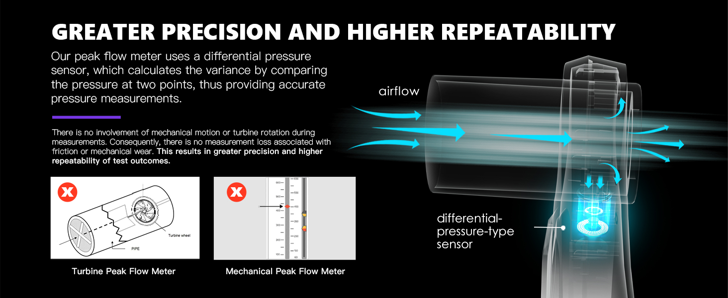 High accuracy & High repeatability-Pressure differential sensor applied ensures the high accuracy. No calibration is needed after manufactured. ATS ERS WRIGHT standards provided.