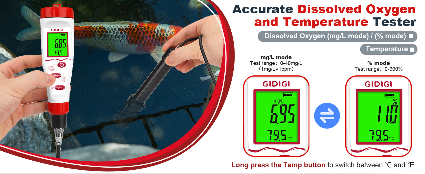 [GIDIGI Service for Every Customer]: GIDIGI dissolved oxygen meter with digital backlight LCD display, which can easily obtain readings in dim environments, and has data lock function and temperature switching function (℉/℃). GIDIGI support 365-day warranty, so there is no need to hesitate to place an order. If you have any questions, please email us and we will respond to you within 24 hours. We are happy to solve any product problems for you.