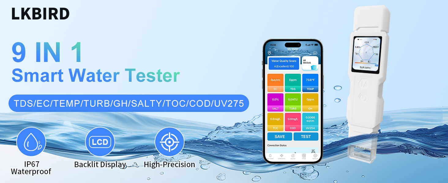 LKBird Exclusive 9-in-1 Water Tester: All-in-One Detection for Turbidity, Hardness, pH, TDS, EC, Salinity, TOC, COD & UV Absorbance with Unique Dual-Core Advantages in Turbidity (NTU) and Water Hardness Testing. Whether checking excessive suspended particles via precise NTU readings or assessing hard water scale risks, this all-in-one device eliminates the need for multiple testers.