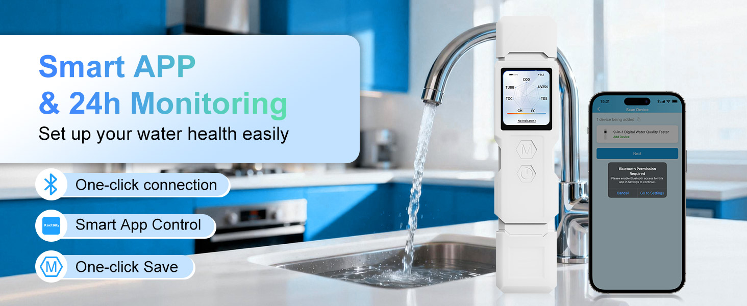 Smart App Connectivity: Equipped with seamless Bluetooth connectivity, simply pair it with our dedicated "Kactoily" App to sync test results to your phone in real time—eliminating the hassle and errors of manual logging. Enjoy permanent storage of historical data, auto-generated trend charts, and multi-scenario data classification and tagging. Whether at home or on the go, easily access past records to gain precise insights for improving water quality, making household health management effortless and worry-free.