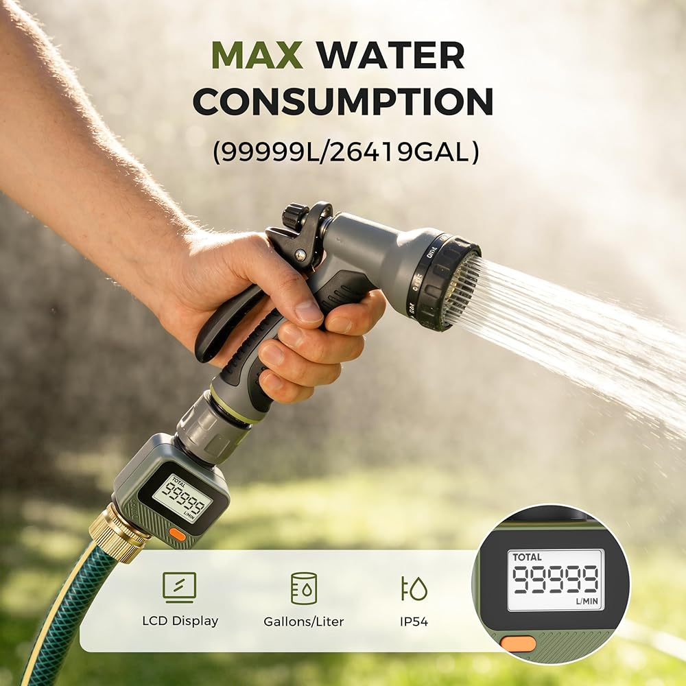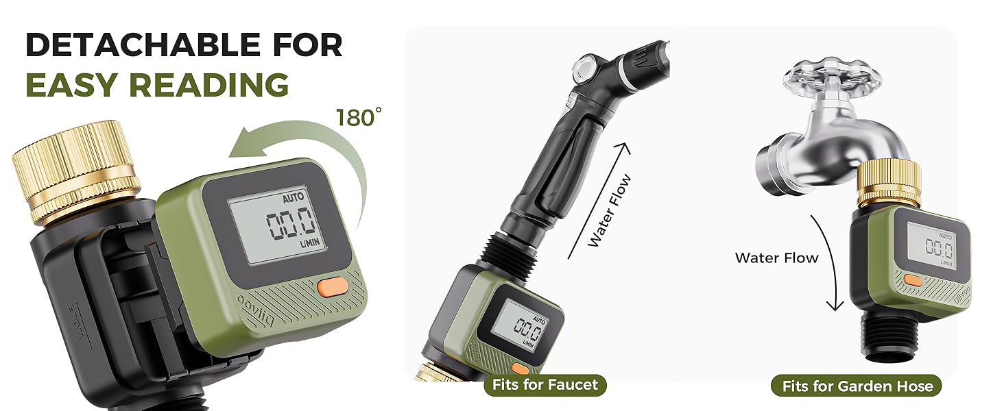 With a detachable 180° LCD screen and one-touch control buttons, reading measurements has never been easier with the Diivoo water flow meter. It easily connects to a garden hose or hose nozzle with standard 3/4-inch hose threads, eliminating the need for additional adapters