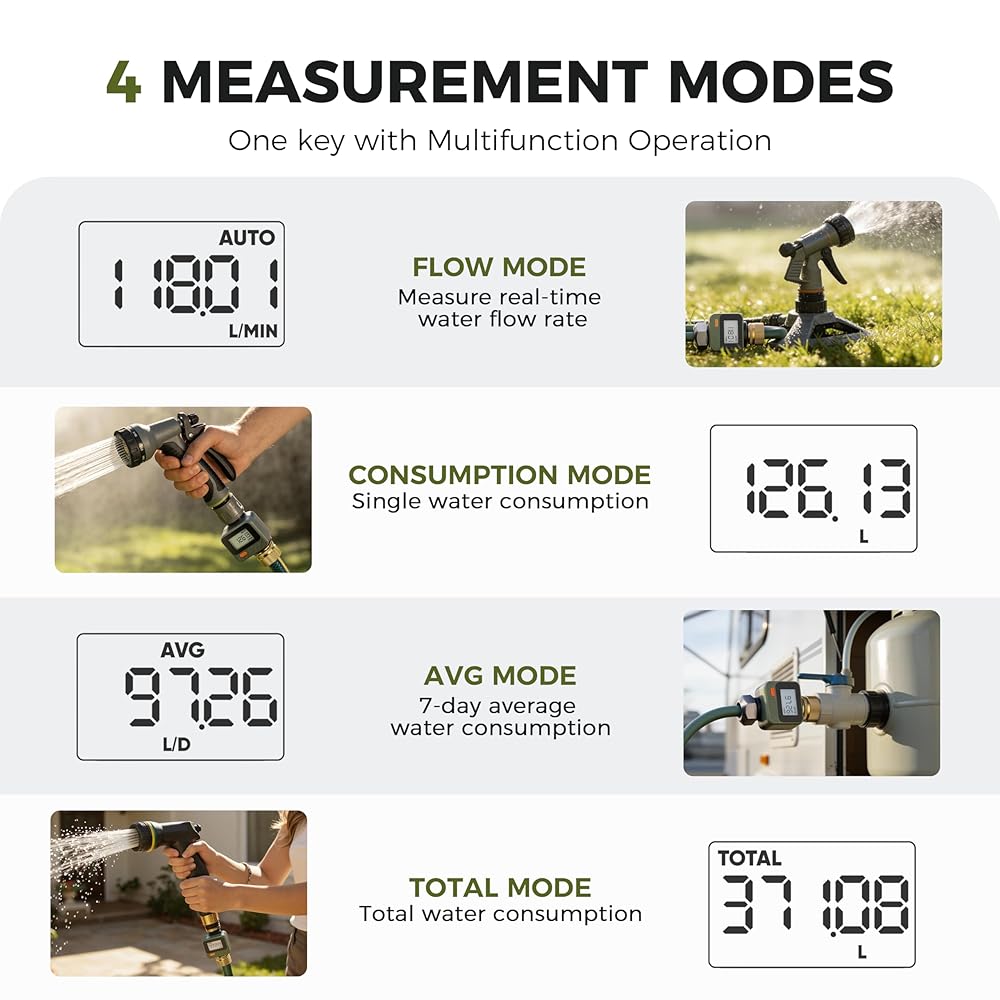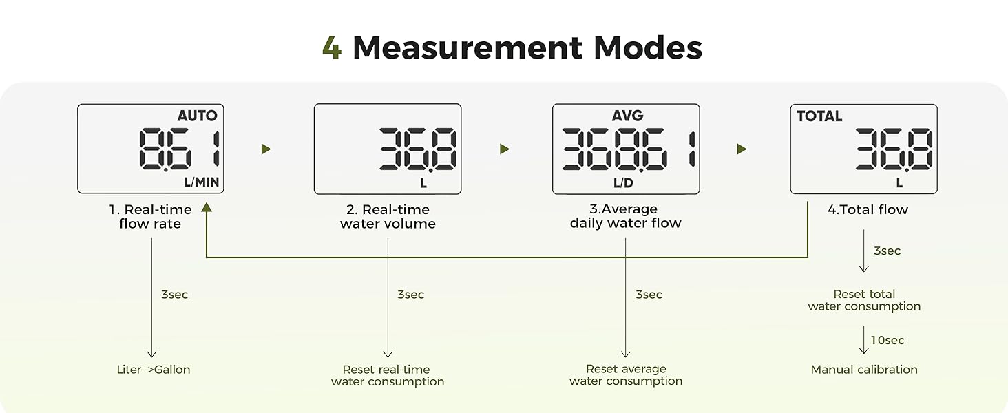 4 Measurement Modes: Freely change from Real-time flow rate, Real-time water volume, Average daily water flow, and Total flow to suit your needs. Measure up to a maximum of 99999L so that you can accurately monitor high-volume water consumption without any limitations