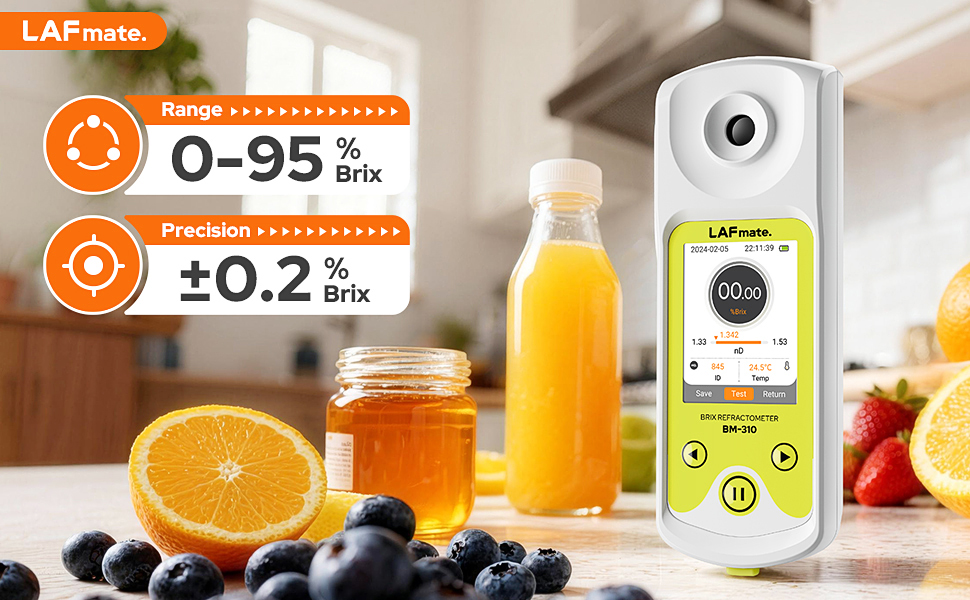 High Precision & ATC: This brix refractometer delivers accurate sugar content measurement ranging from 0–95% Brix, with ±0.2% precision and 0.05% resolution. It also measures Refractive Index (RI) for broader sample analysis. Equipped with built-in Automatic Temperature Compensation (ATC), it ensures reliable readings between 5°C–40°C. Ideal for wine making equipment and coffee refractometer use