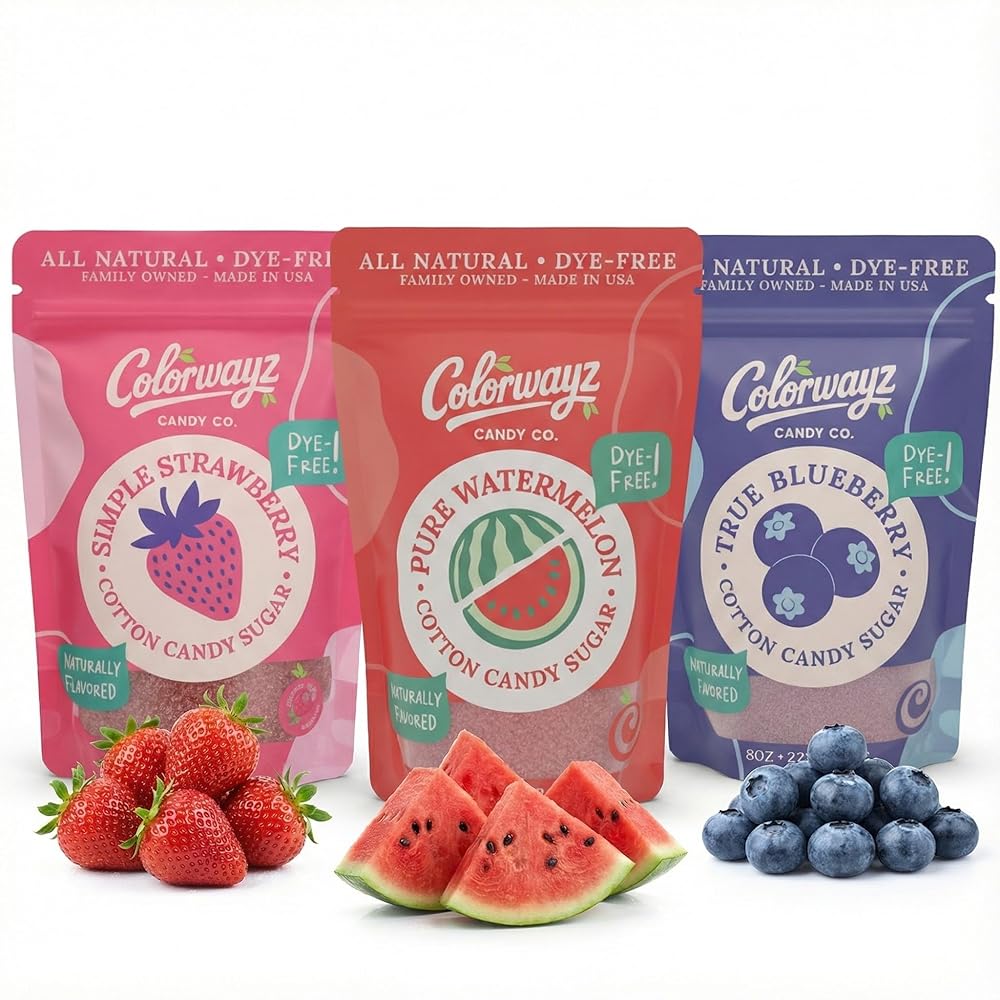 Flavored Cotton Candy Sugar Trio – Fun 3-pack of cotton candy sugar includes Simple Strawberry, True Blueberry, and Pure Watermelon flavors. A playful cotton candy sugar flavors line-up that makes every spin more exciting, with naturally colorful results in every bag.