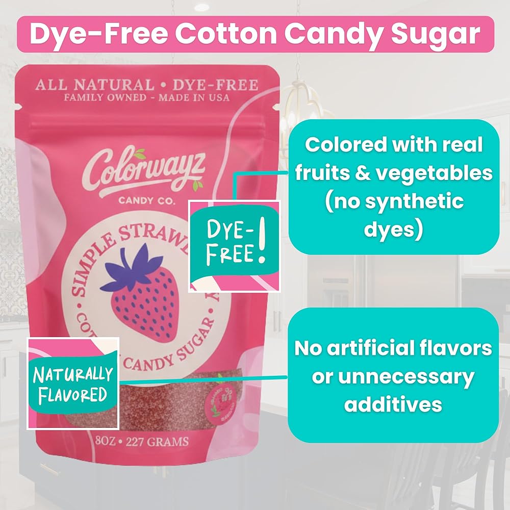 Dye-Free Cotton Candy Sugar – Clean ingredients for peace of mind. This dye free cotton candy sugar is made without artificial dyes or unnecessary additives, giving you dye free candy that delivers the same sweet fun with a cleaner twist.