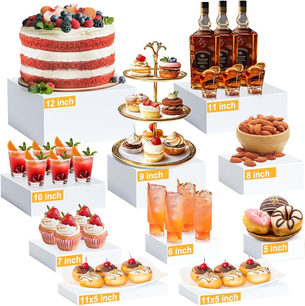 VERSATILE 10-PIECE SET in VARIOUS SIZES: This set includes 10 white acrylic display risers in various sizes, large 12''x 12''x 6'', 11''x 11''x 4'', 10''x 10''x 3'', 2pcs 11x 5.5''x 1'', medium 9''x 9''x 2'', 8''x 8''x 4'', small 7''x 7''x 3'', 6''x 6''x 2'', 5''x 5''x 2''. Offering endless possibilities for showcasing food, cakes, appetizers, jewelry, and collectibles at parties