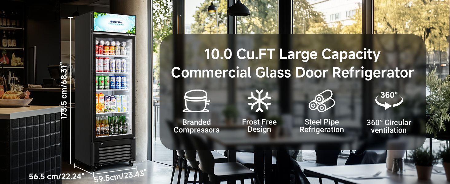 【Spacious Commercial Refrigerators】 BODEGACOOLER commercial display refrigerator features a spacious 10.0 Cu. Ft. of space and 4 removable shelves (including 1 drink organizers). The Commercial Merchandiser Refrigerator's adjustable shelves are ergonomically designed to allow you to easily adjust the internal height structure. Display fridge can also be used as back bar cooler, allowing you to easily display a variety of items to better catch the eye of your customers.
