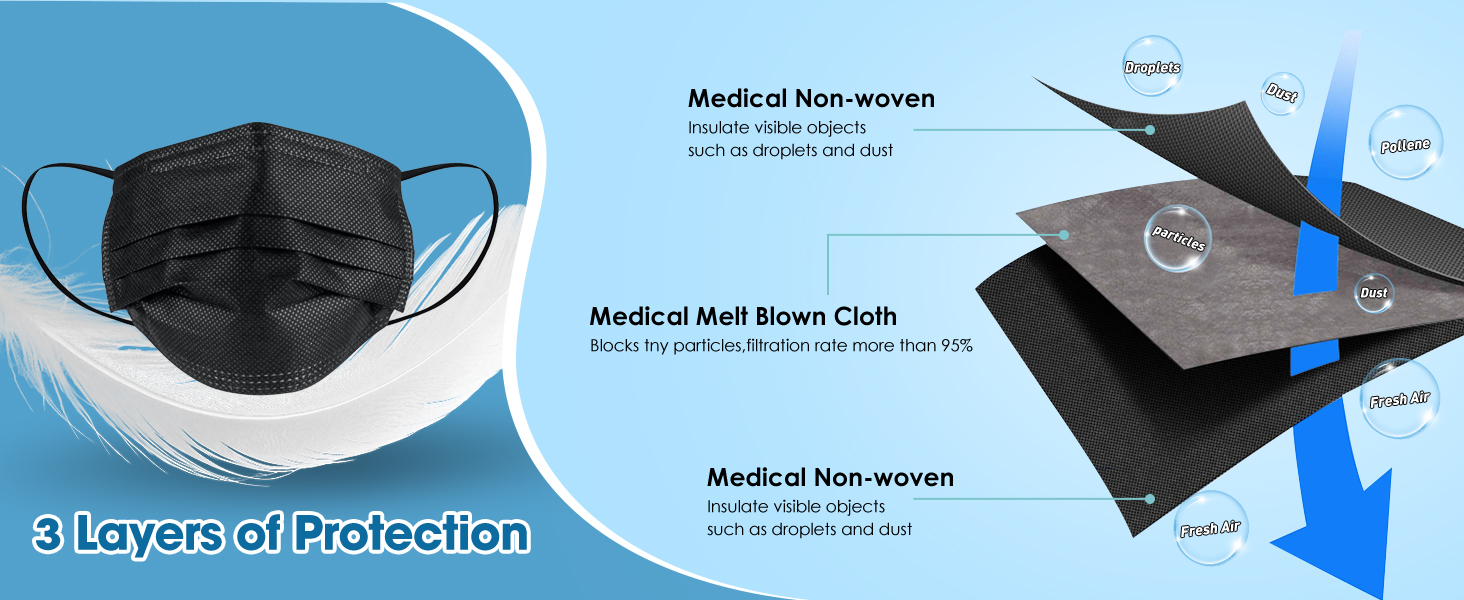 The 3-ply 5 Color disposable face masks,made of two layers of non-woven fabric and one layer of melt-blown fabric.