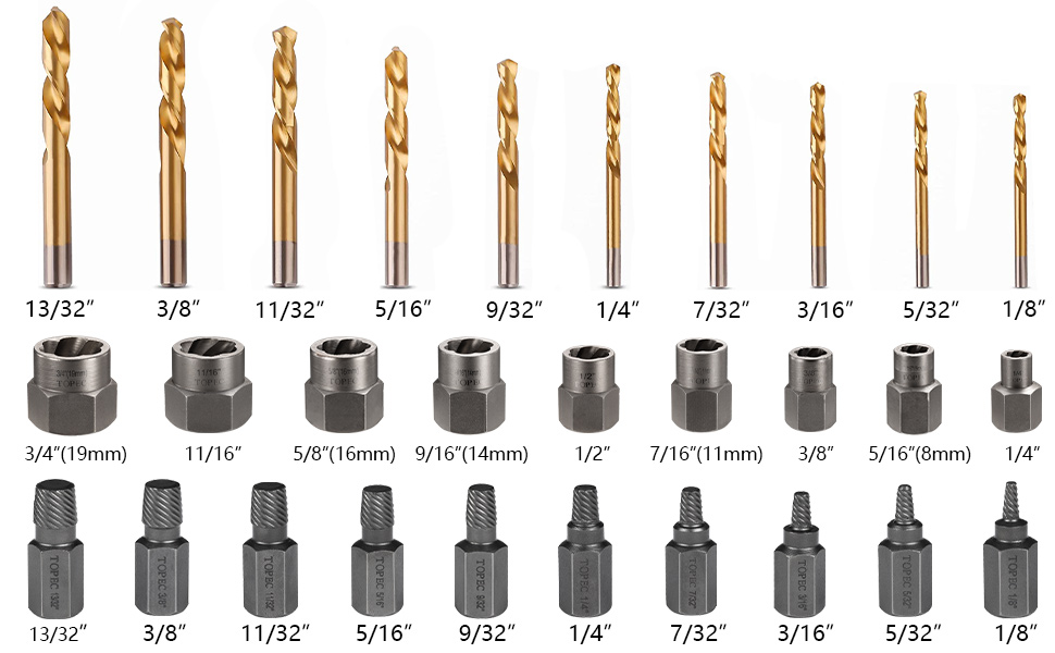 【HIGH QUALITY】: The nut remover/multi-spline screw extractor are made of high hardness chrome-molybdenum steel. Reverse spiral groove design bending down to provide maximum grip force to easily remove damaged bolts, nuts, broken screws. The left hand drill is made of HHS and the head is designed with a 135° angle. which is not easily worn and has strong penetration. Surface titanium nitride coating, effective anti-corrosion and rust prevention, extending service life.