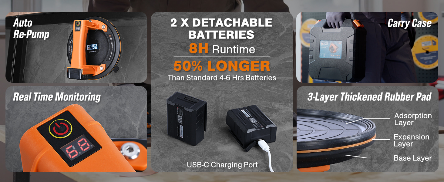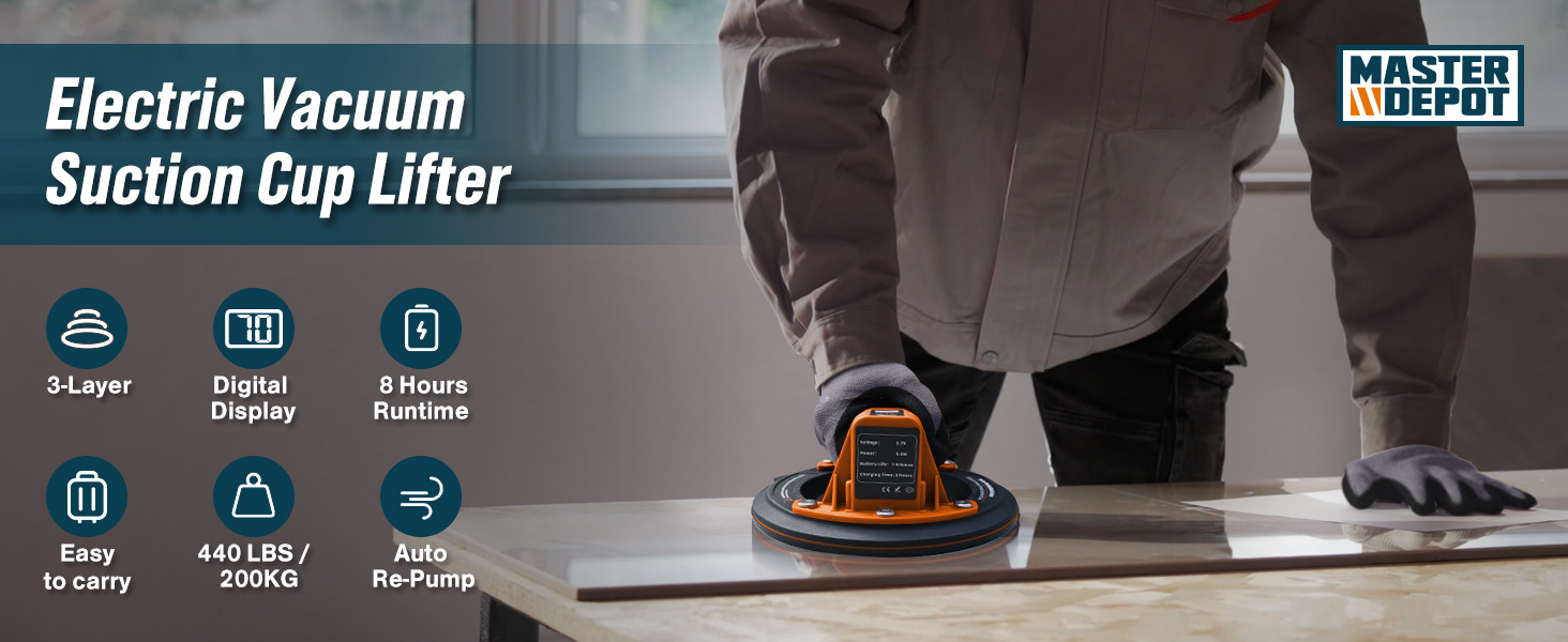 【𝟰𝟰𝟬𝗟𝗕𝗦 𝗦𝘂𝗽𝗲𝗿 𝗦𝘁𝗿𝗼𝗻𝗴 𝗦𝘂𝗰𝘁𝗶𝗼𝗻】This electric suction cup is equipped with 440LBS of super strong suction, making it a reliable choice for lifting heavy objects. The vacuum suction cup is suitable for smooth surface 440LBS materials within, and is especially ideal for carrying tiles during home renovations, installing indoor glass windows, and transporting light metal parts in small processing plants.