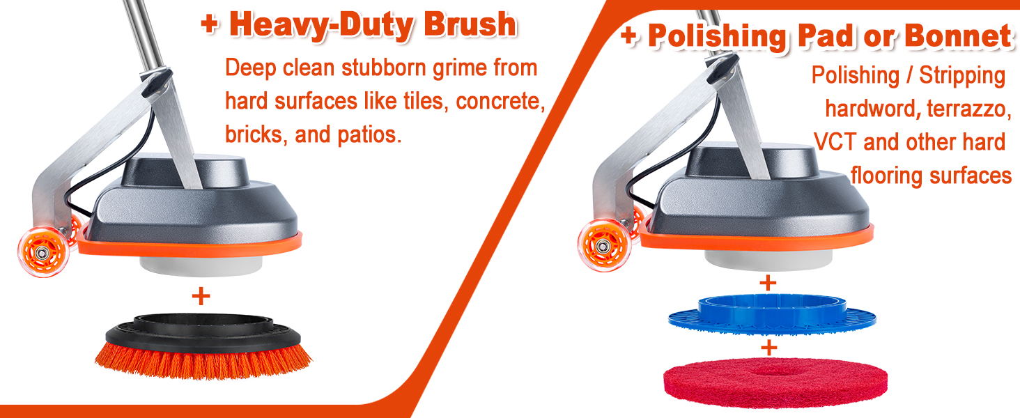 VERSATILE MULTI-SURFACE USE- Works effectively on tile, hardwood, concrete, vinyl, marble, and even carpet (with soft brush/ Carpet Bonnet Pad)
