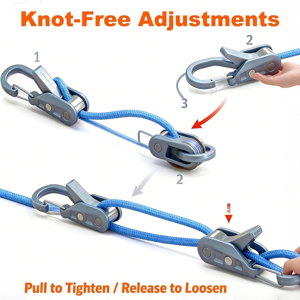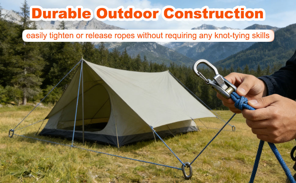 【Knot-Free Adjustments】This rope adjuster features a smooth-operating cam mechanism, that allows users to easily tighten or release ropes without requiring any knot-tying skills, making it ideal for fast campsite setups and adjustments in changing weather conditions.