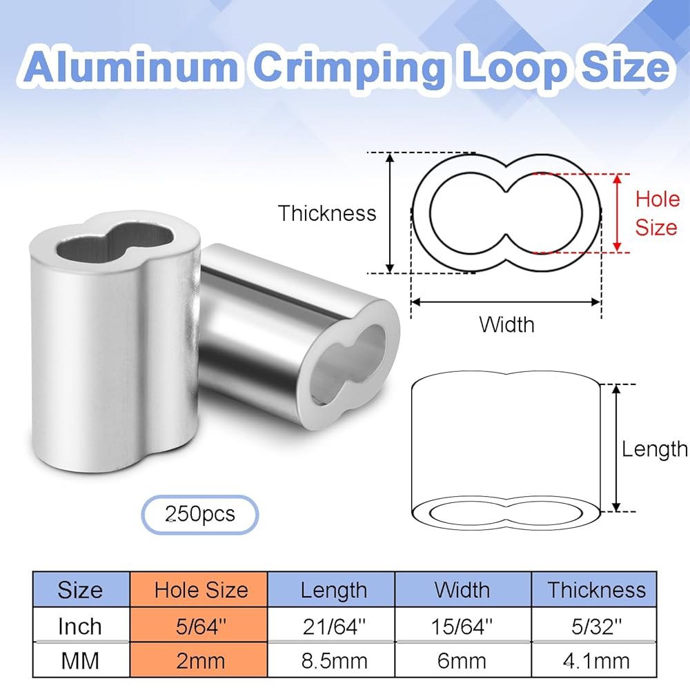 ☆【Package Include】250PCS Aluminum Crimping Loop Sleeve fit for wire rope and cable line end with 1/16''(1.5mm) diameter can meet your different needs in daily life.