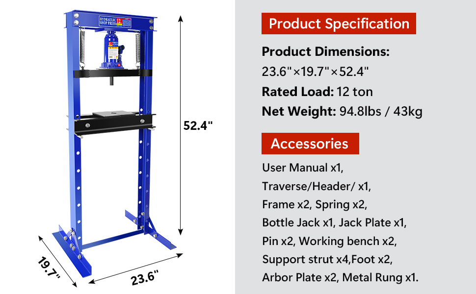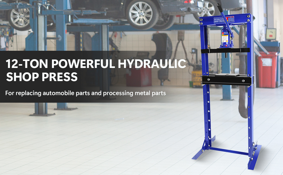12-TON CAPACITY: The shop press equipped with a 12-ton capacity bottle jack, this press facilitates easier straightening or bending of metal. Ideal for metalworking tasks such as bending, straightening, and stamping, it provides reliable support for various operations.