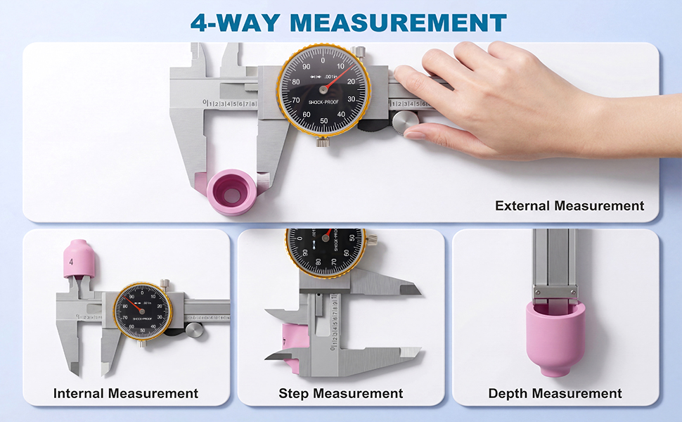 4-Way Measurement: Features dual jaws and a depth rod to perform inside, outside, depth, and step measurements—all with one versatile instrument for comprehensive utility.