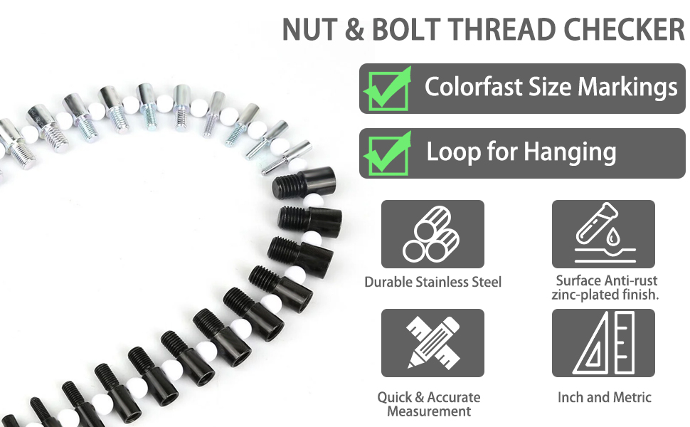 How to use: Every single gauge has a male threaded stud on one end for nut check and a female threaded socket on the other end for bolt check. Just screw the nut or bolt onto thread gauge. Only take seconds to check the size