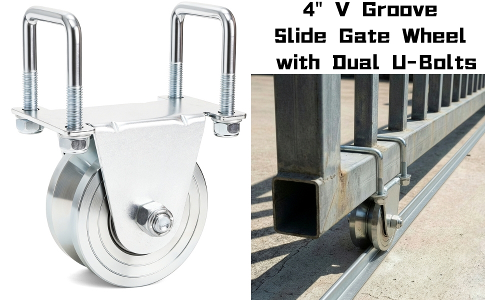 Coloch 4" V Groove Slide Gate Wheel with Dual U-Bolts, Heavy Duty Sliding Gate Wheel with External Mount Bracelet, No Welding Needed for Inverted V-Shape Sliding Rolling Track Gate, Loading 3000lbs