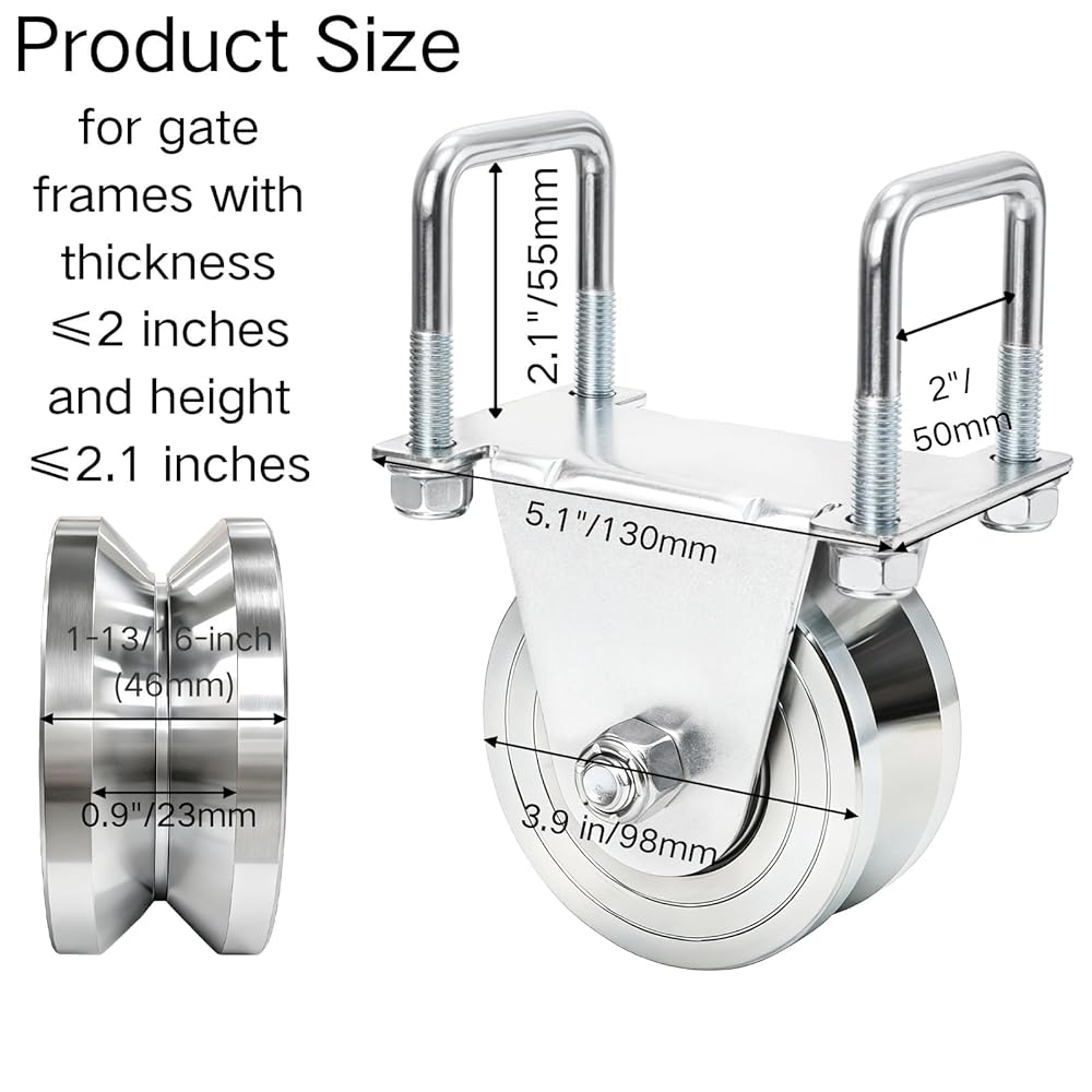 Specification: With a 3.8 inch (98mm) diameter and 1-13/16-inch (46mm) thickness, this V-groove gate wheel features dual-sealed bearings and supports up to 3000 lbs, making it ideal for large driveway and security slide gates.