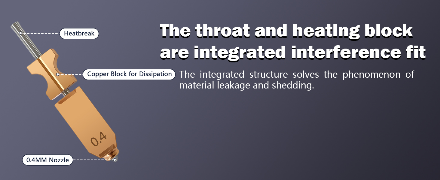 【Leak-proof Filaments Design】: The nozzle and throat tube are crafted using an integrated, all-metal molding process, eliminating the issue of melted filament leakage that arises from threaded connections or aging sealing rings in traditional split-type nozzles.