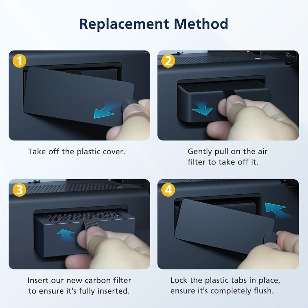 【EASY TO INSTALL】: The activated carbon air filter for lab p1p is plug-and-play and very simple to swap out. ① Take off the plastic cover ② Gently pull on the air filter to take off it ③ Insert our new carbon filter ④ Lock the plastic tabs in place