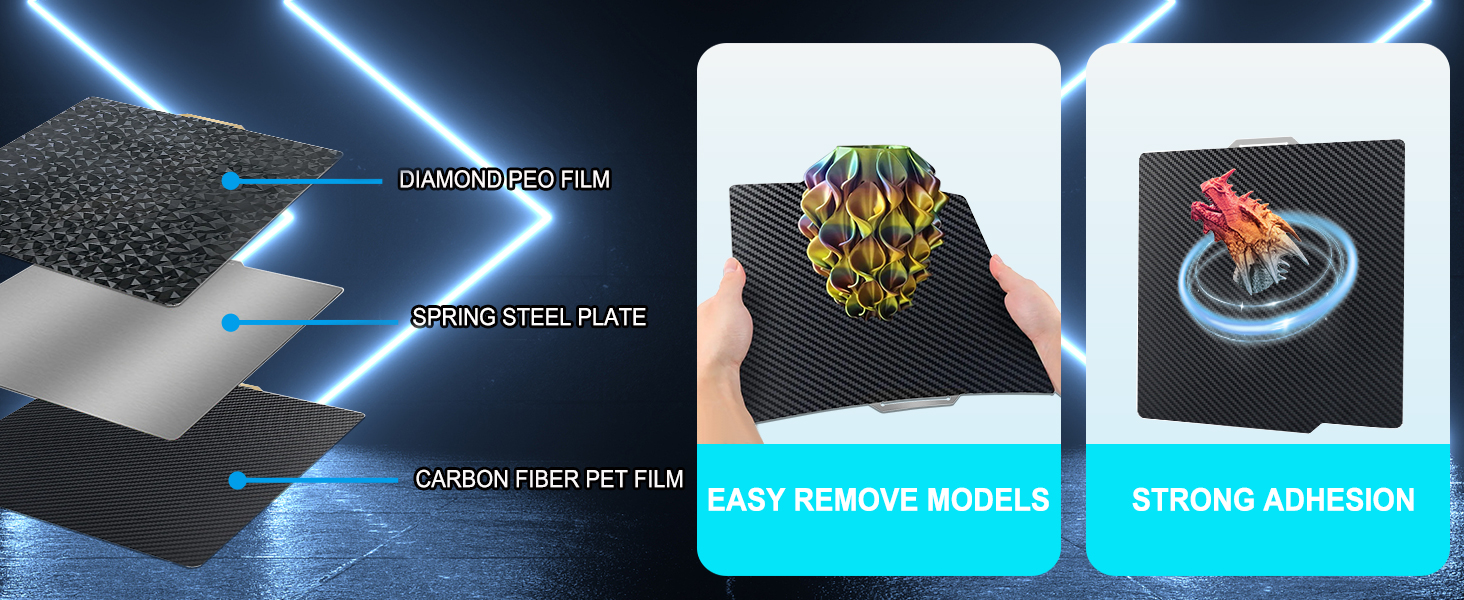 Experience our versatile PET+PEO double-sided printing platform! smooth PEO looks like countless diamonds on the surface,which make your eyes light up. Carbon fiber PET ensures optimal material compatibility and flat print bottoms