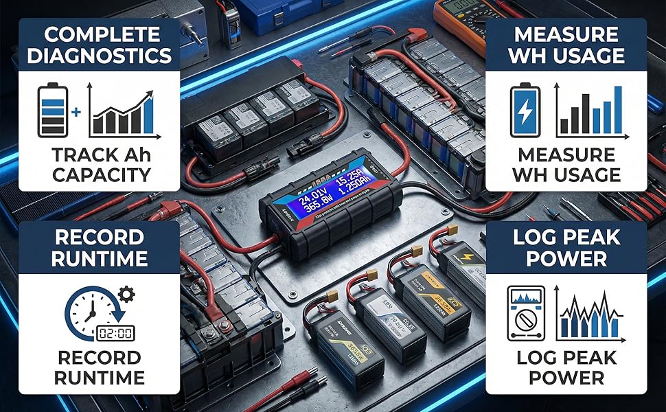 Versatile Applications: This high-precision power analyzer caters to diverse operational needs. It effectively evaluates RC battery charging efficiency, power consumption of battery-powered devices, and operating voltage—ensuring batteries, motors, wiring, and connectors function reliably.