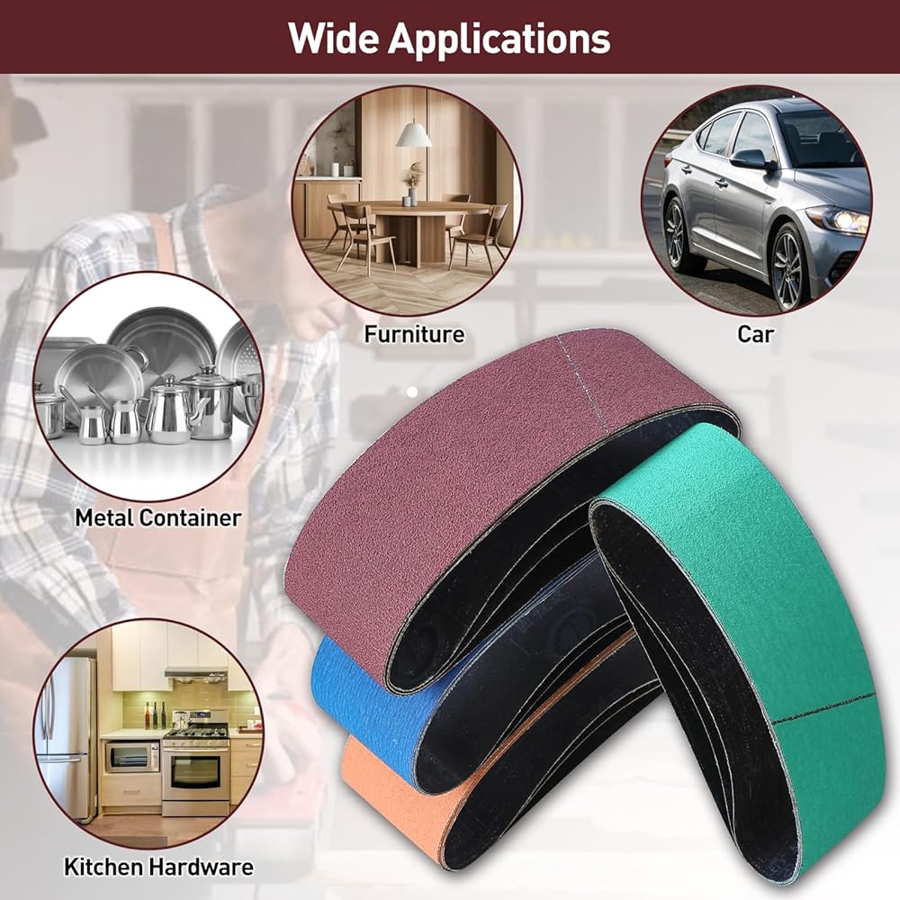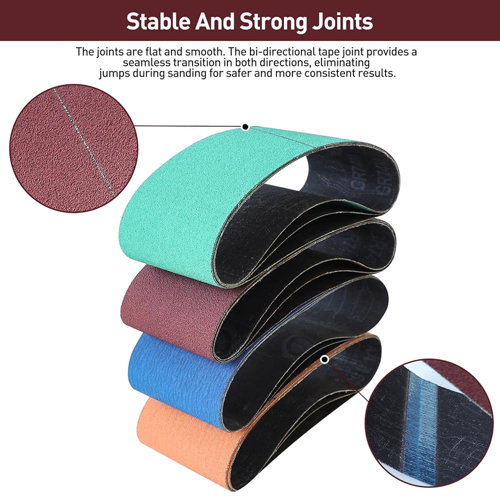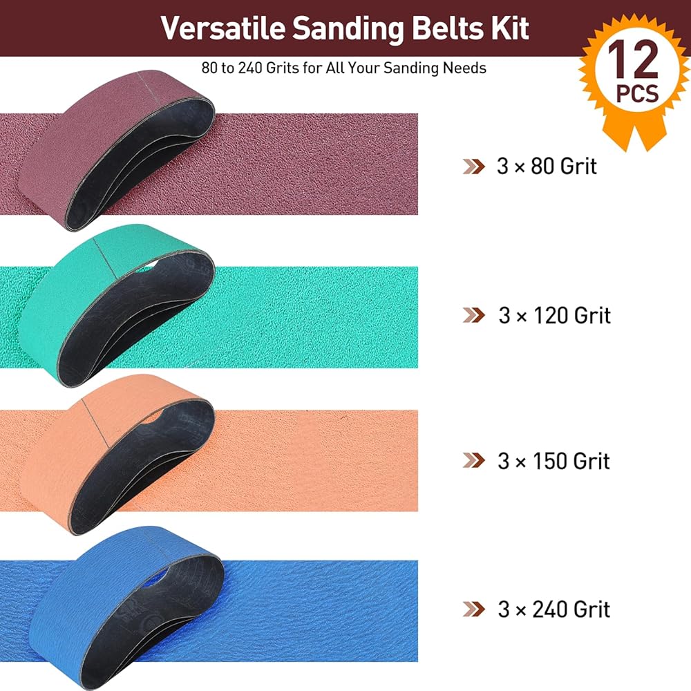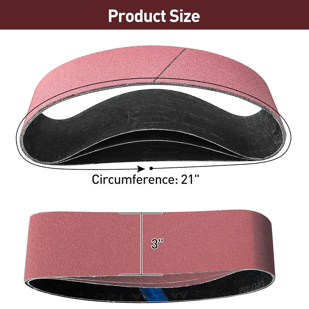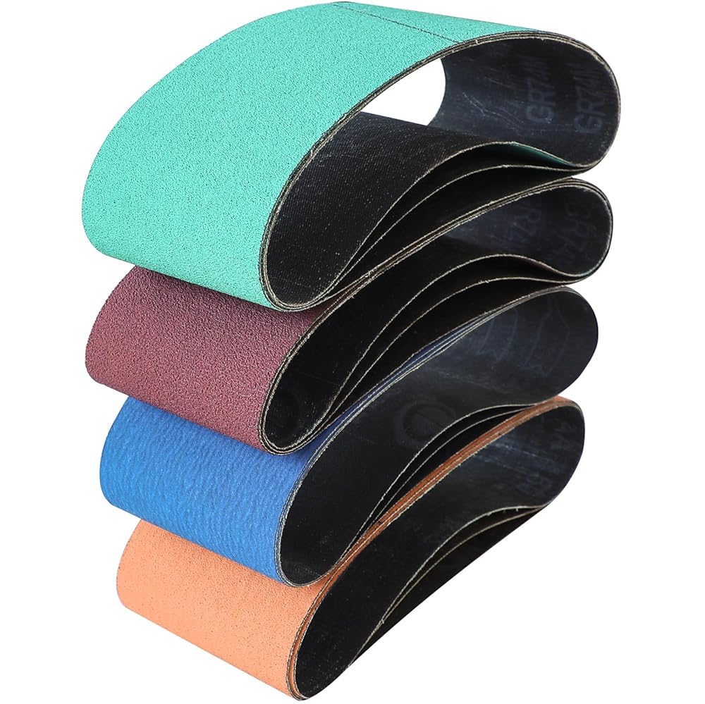 【Package Included】12 pcs 3" × 21" Sanding Belts Include: 3 pcs maroon of 80 grit alumina oxide belts, 3 pcs teal of 120 grit alumina oxide belts, 3 pcs burnt orange of 150 grit alumina oxide belts, 3 pcs blue of 240 grit alumina oxide belts.
