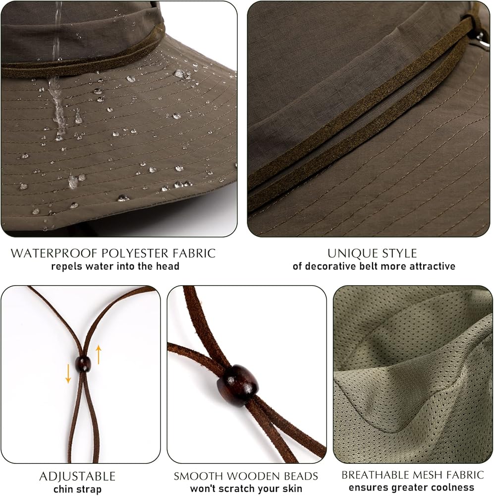 ADJUSTABLE & FASHIONABLE: This wide brim hiking adventure hat uv protection has only one size fits 21.65"-23.62" unisex head circumference. This ultra light windproof bucket hat has a decorative belt to make it more stylish and attractive. The adjustable chin strap ensures that the cap is always fixed in a comfortable position. Even in windy and rainy weather outdoors, it is not easy to be blown away.