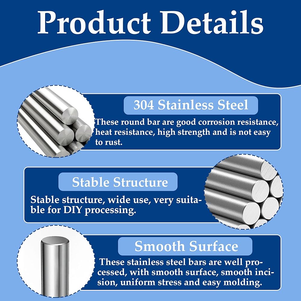 Premium 304 Stainless Steel:Crafted from durable 304 stainless steel, this round rod offers reliable strength and resistance to rust for your various project needs, supporting long-term use in different environments.