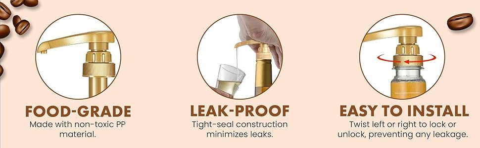 No Leak Lock Design: Twist-lock head keeps the pump sealed to stop leaks, drips, and sticky bottles. Press to pump, twist to lock when not in use. Tight screw cap holds firmly on the bottle so syrup does not run down the sides or make a mess on your counter or coffee station.