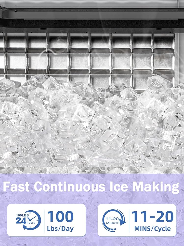 Powerful & Efficient Ice Production: Produces 100 lbs of ice per day with a fast cycle time (11-18 minutes per batch). Features a high-efficiency commercial compressor for low noise, high efficiency, and energy-saving performance.