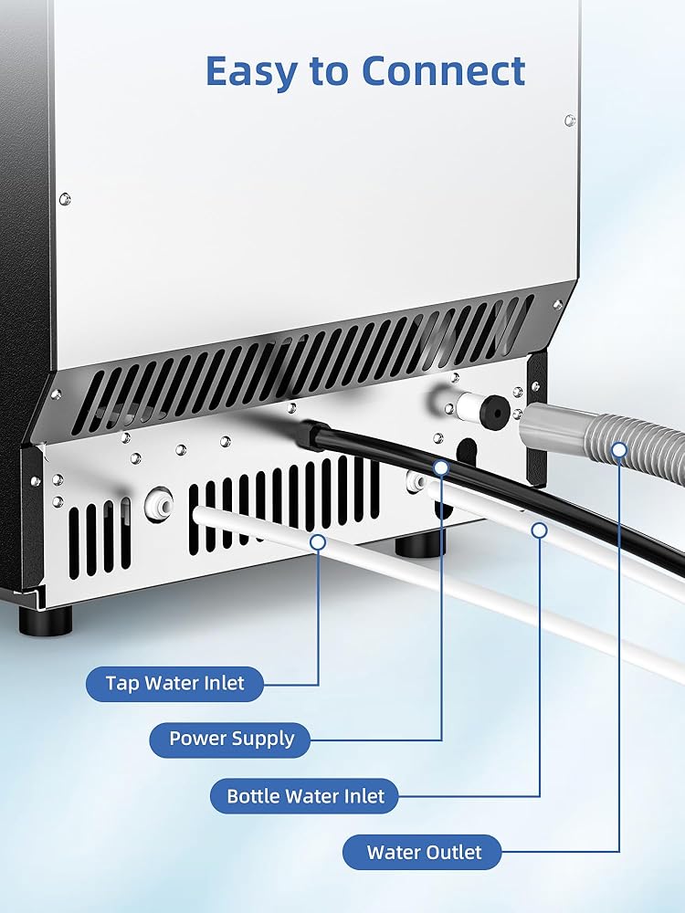 Large Storage: Stores 33lbs of ice with an insulated bin to extend ice retention.Dual water inlet options for versatile installation in any setting.