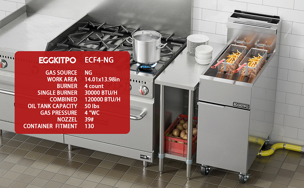 Natural Gas Heating: The gas fryer equipped with 4 hign-efficiency cast iron burnersis.(30,000 BTU each, 120,000 BTU total) It can create reliable, even heat distribution for consistent cooking results. The 3/4-inch connection is a universal connection size, making the process of connecting to natual gas fuel convenient