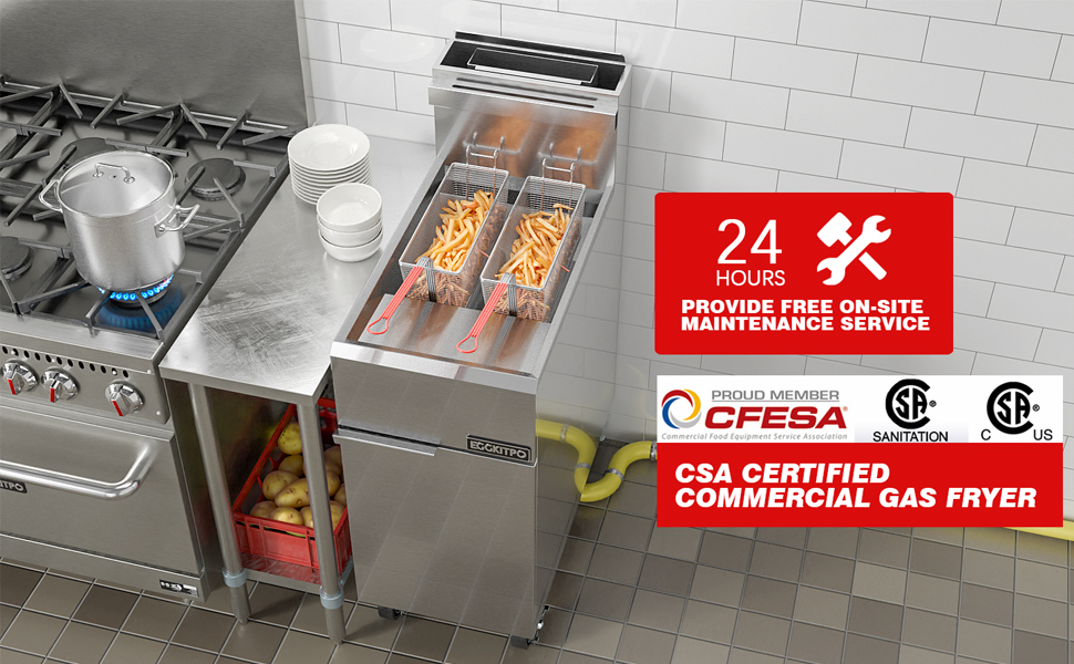CSA Certified and Safety: The gas floor model fryer is CSA certified for commercial standards. This standing floor fryer meets rigorous requirement for gas appliance, ensuring safe operation in high-traffic kitchens. Heat-resistant handles and components protect staff during service. The base is fitted with 4 casters and the 2 front casters have a locking brake, which ensures safe use and easy mobility