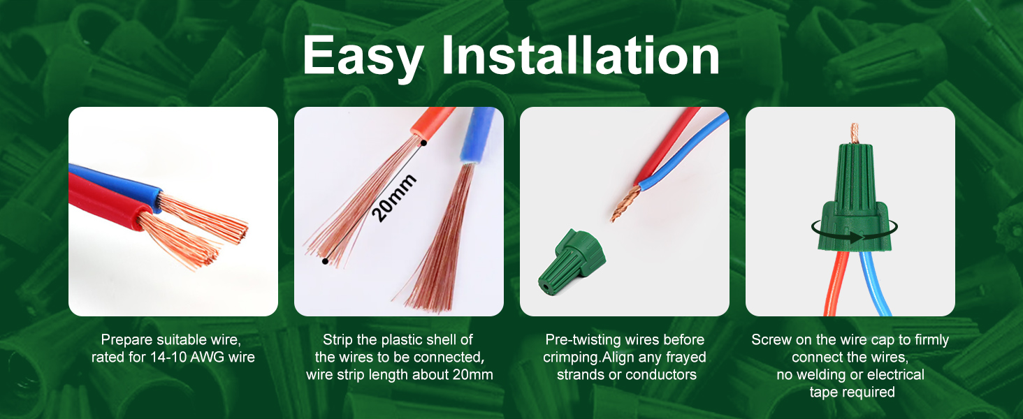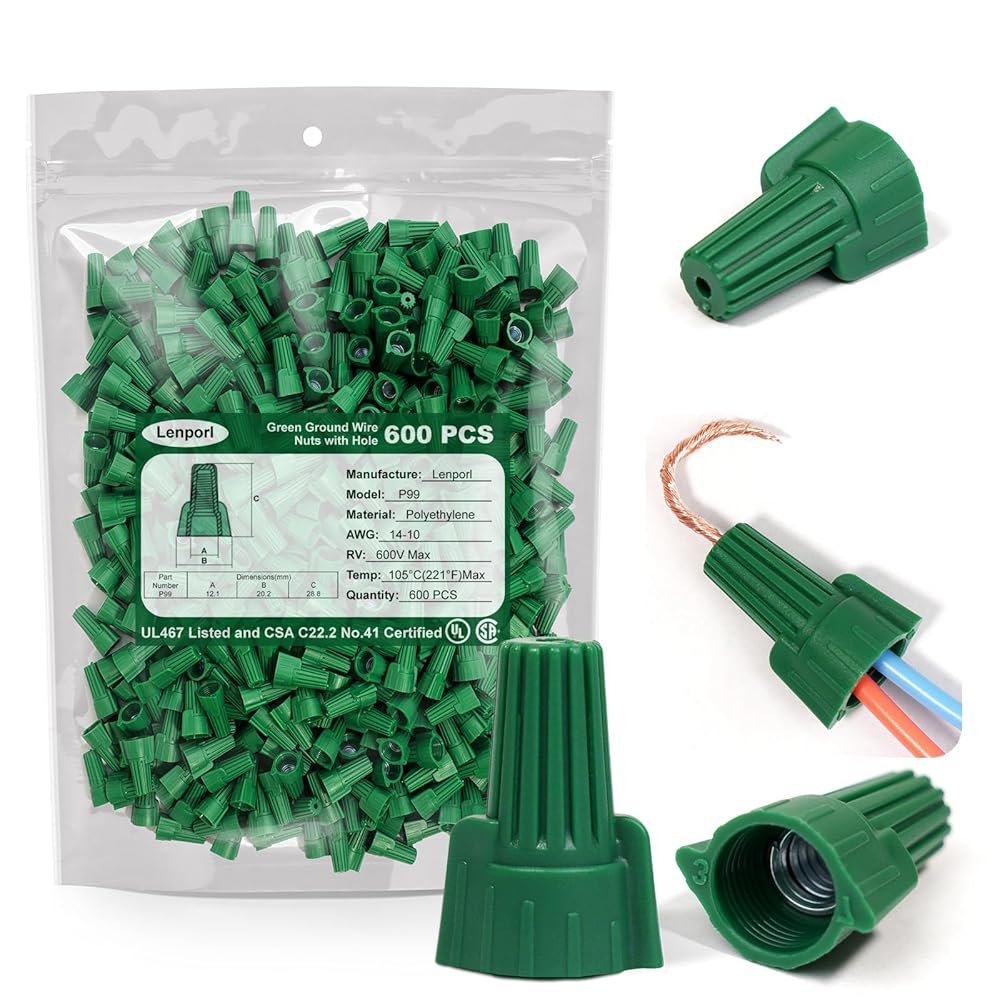 ✅Durable and Heat-Resistant: Constructed from durable thermoplastic material, our green wire nuts can withstand high temperatures up to 221°F (105°C) and rated for 600V in building wiring and 1000V in lighting fixtures and signs. This makes them ideal for use in environments where heat is a concern, such as in automotive or industrial settings. The thermoplastic material is also flame-retardant, providing an additional layer of safety and protection, ensuring the reliability and longevity of the ground wire connectors