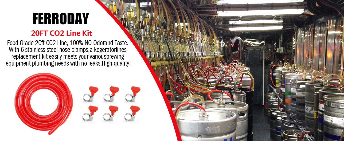 20 Feet ID 5/16" CO2 Line Ttubing: The 20ft gas lines is ID 5/16" & OD 9/16", CO2 kegerator line replacement kit with 6 beer line clamps. Compared with the traditional 8mm ID red gas hose, 7.5mm ID CO2 gas line hose better fits with 5/16" gas barbs to tightly prevent CO2 gas loss, easy installation, and easy cutting with a razor. It has good sealing properties during use. Smooth CO2 gas hose tube cross-sections are available for tighter barb connection, with no gas loss at all.