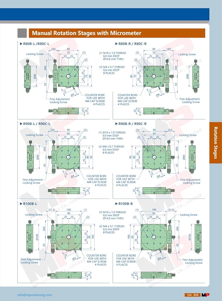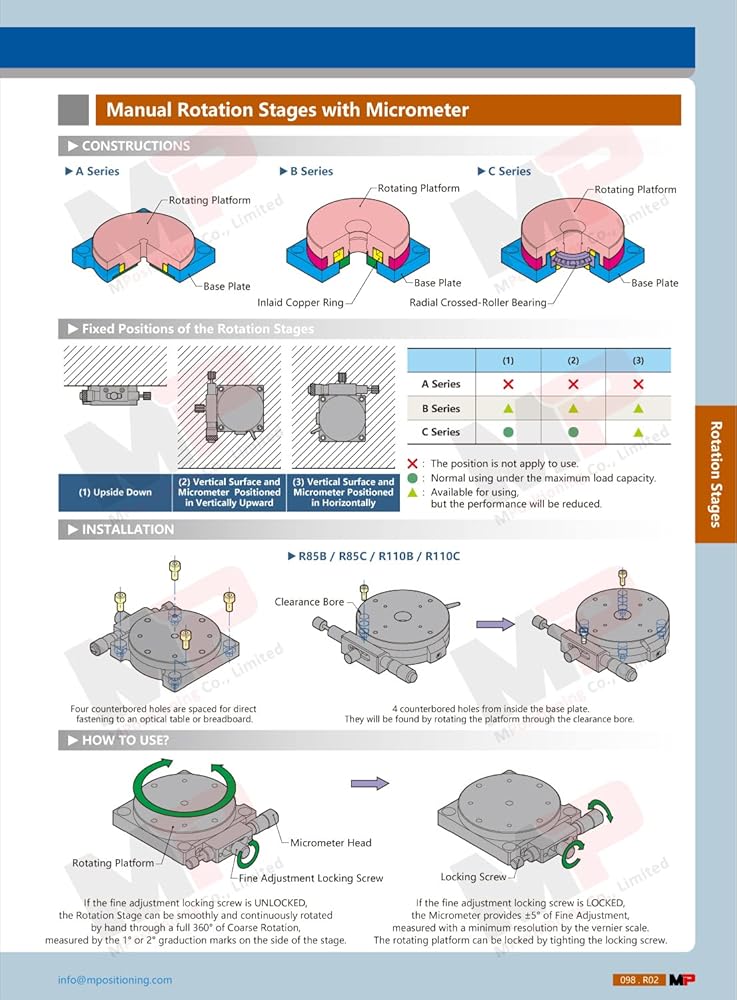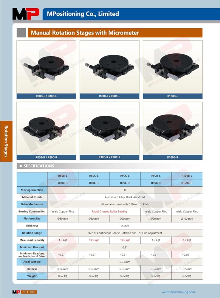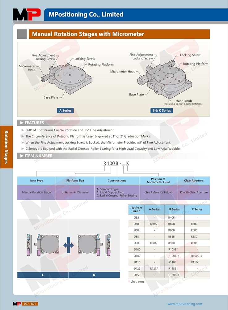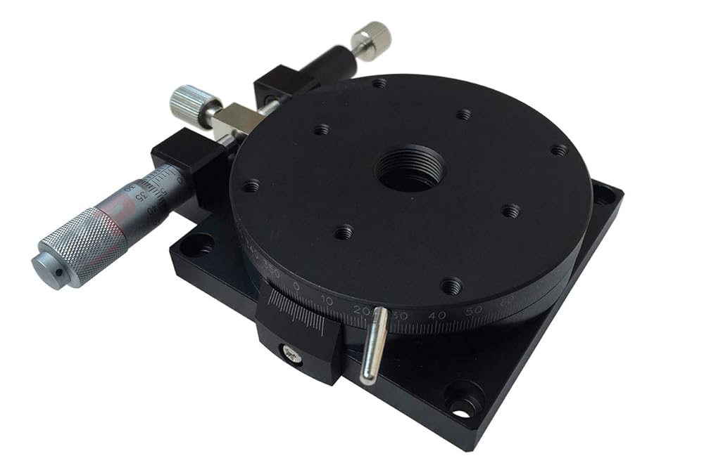 The Precision Manual Rotation Stage combines easy-to-use manual rotation with high precision micrometer adjustment. While the rotary table dial is an unlocked state, smooth rotation can be measured with 1 degs graduation marks. When locked, the dial is adjusted by the precision micrometer head with +/- 5 degs fine rotation. The modular design allows to be set up in X-Rotation, XY-Rotation or XYZ-Rotation configurations by using our standard Manual Positioning Stages, like the model T80X or T80Z-10B series.