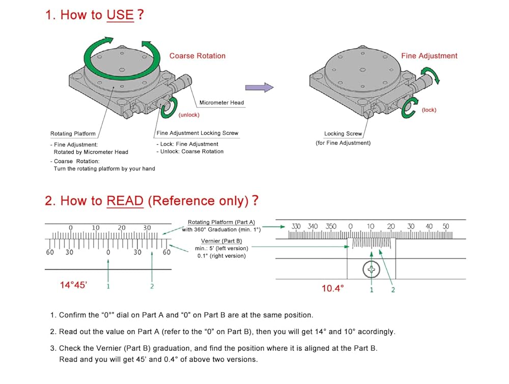 360 Degs coarse rotation, +/- 5 degs of fine rotation when locked