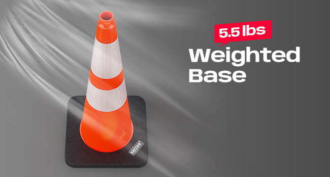 BLACK WEIGHTED BASE: These safety cones are 28 inches tall and feature a heavy duty black rubber base that ensures they stay upright and are not easily knocked over by people or cars. They also remain stable in high winds, heat, direct sunlight and other inclement weather